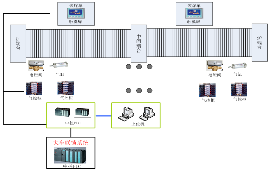 對上升管、內(nèi)翻板和高低壓氨水的相關(guān)動(dòng)作和時(shí)間進(jìn)行記錄,并對某一動(dòng)作時(shí)間和動(dòng)作間間隔等進(jìn)行統(tǒng)計(jì)。可根據(jù)操作方式、操作內(nèi)容和時(shí)間等進(jìn)行查詢。整個(gè)包括現(xiàn)場機(jī)械部分、現(xiàn)場 氣控柜部分、中控室部分、車載部 分和系統(tǒng)網(wǎng)絡(luò)。其中,現(xiàn)場部分是 系統(tǒng)的基礎(chǔ)硬件部分,其他三部分 為控制部分。現(xiàn)場部分包含上升管蓋、內(nèi)翻板和高低壓氨水實(shí)現(xiàn)自動(dòng)控制所包含的氣缸、電磁閥及相關(guān)連接件。其他電氣和控制部分主要包含氣動(dòng)閥組、PLC模塊和上位機(jī)等,分別用于對現(xiàn)場設(shè)備狀態(tài)采集和控制指令輸出、系統(tǒng)的控制邏輯判斷和指令下發(fā)和數(shù)據(jù)存儲(chǔ)、展示以及人機(jī)交互操作。